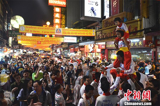 10月7日,正值泰国一年一度的九皇斋节期间。曼谷唐人街到处飘着黄色的“斋”旗,上百家糕点、水果、面类等素食摊位在街道两旁摆开,具有中华传统特色的舞龙队伍夺人眼球,让多国游客在泰国感受中华文化,享受中泰美食。据了解,九皇斋节并非佛教节日,而是起源于华人习俗,后来融入健康、环保及佛教理念,逐渐成为全泰国民众共同欢度的节日。 中新社记者 缪超 摄