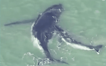 近日,在北斯特德布鲁克岛附近,一只勇敢的座头鲸宝宝奋力营救了搁浅的妈妈。它聪明地用自己身体托起妈妈,减少海床摩擦力,让妈妈的大尾巴获得推进力,最终成功使妈妈脱离险境,最后母子俩朝着大海深处游去。