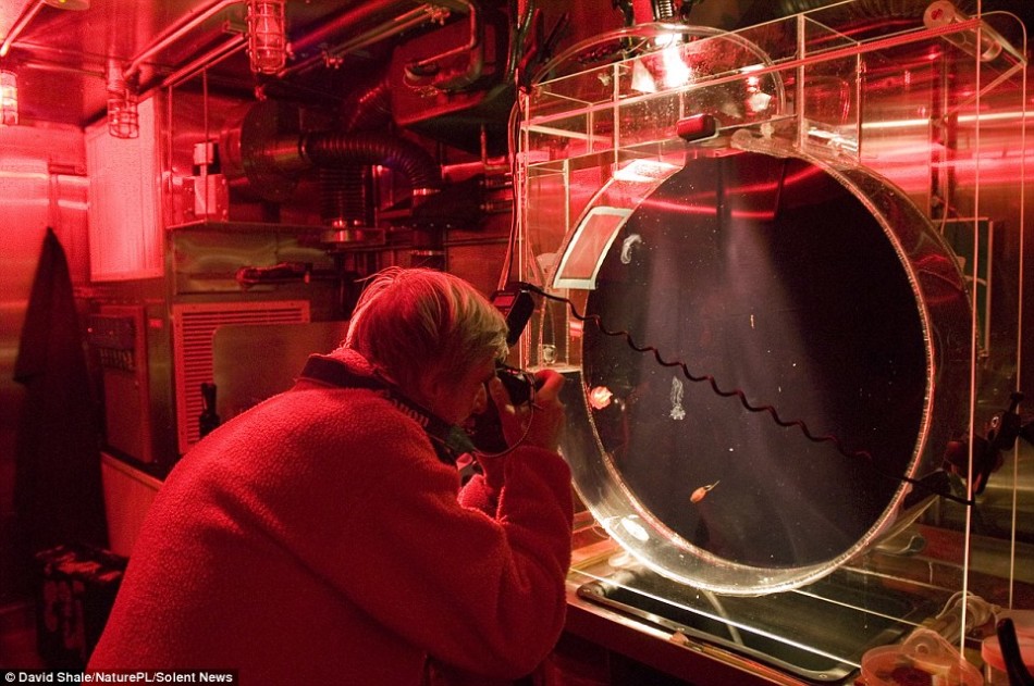 现年70岁的英国野生生物摄影师谢尔在冷藏室内进行拍摄。