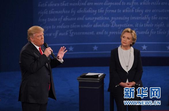 10月9日,在美国密苏里州圣路易斯市的华盛顿大学,美国共和党总统候选人唐纳德·特朗普(左)和美国民主党总统候选人希拉里·克林顿参加2016年美国总统候选人第二场电视辩论。新华社记者殷博古摄