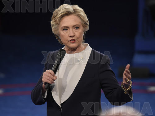 10月9日,在美国密苏里州圣路易斯市的华盛顿大学,美国民主党总统候选人希拉里·克林顿参加2016年美国总统候选人第二场电视辩论。(新华社/美联)