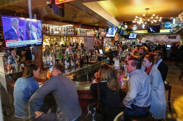 10月9日,纽约,人们在一间酒吧内观看美国总统候选人第二场电视辩论。(新华/法新)