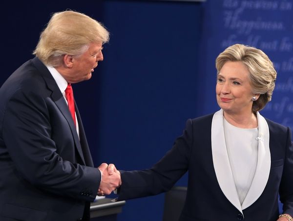 10月9日,特朗普与希拉里在辩论结束后握手。(新华/法新)