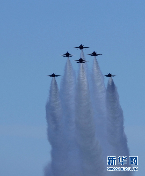 美国海军“蓝天使”特技飞行队参加飞行表演。新华网发(董旭东摄)
