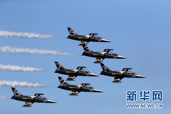 法国“百年灵”喷气机特技飞行队参加飞行表演。新华网发(董旭东摄)
