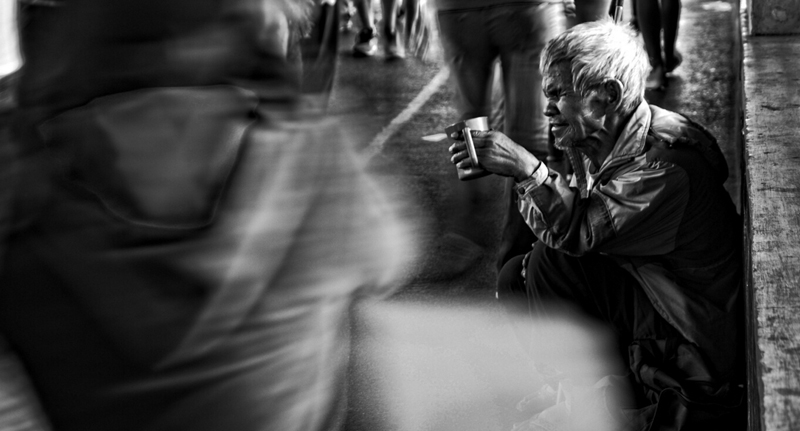 联合国一份报告显示,全世界大约有1亿无家可归的人,他们每天都要在绝望中求生。为了纪念10月10日的世界流浪者日(World Homeless Day),英国照片社区photocrowd组织了一场摄影比赛,要求参赛者们用镜头记录无家可归的人们。图为菲律宾一名男子手持杯子蹲坐在街边乞讨。