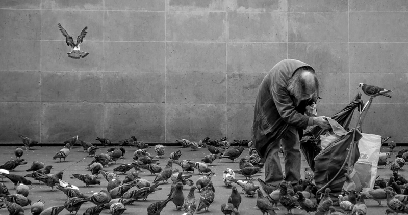 联合国一份报告显示,全世界大约有1亿无家可归的人,他们每天都要在绝望中求生。为了纪念10月10日的世界流浪者日(World Homeless Day),英国照片社区photocrowd组织了一场摄影比赛,要求参赛者们用镜头记录无家可归的人们。图为法国一位衣衫褴褛的老者在广场喂食鸽子。