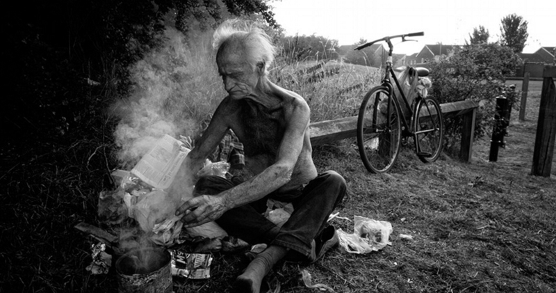 联合国一份报告显示,全世界大约有1亿无家可归的人,他们每天都要在绝望中求生。为了纪念10月10日的世界流浪者日(World Homeless Day),英国照片社区photocrowd组织了一场摄影比赛,要求参赛者们用镜头记录无家可归的人们。图为英国一位骨瘦嶙峋的老者在草地生火求生。