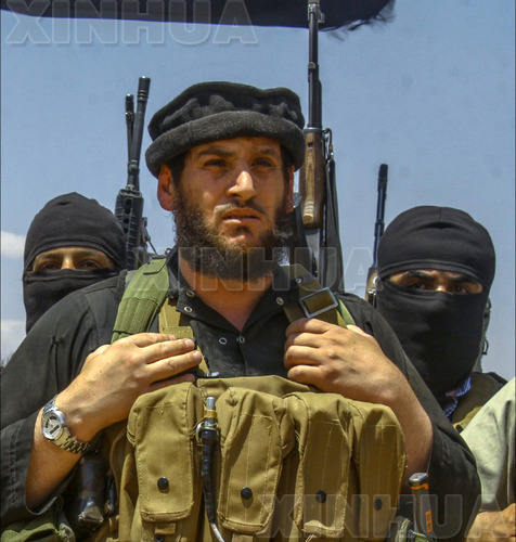 这是“伊斯兰国”某周刊发布的据称是该组织前发言人阿布·穆罕默德·阿德纳尼(中)的资料照片(拍摄时间及地点不详)。新华社/法新