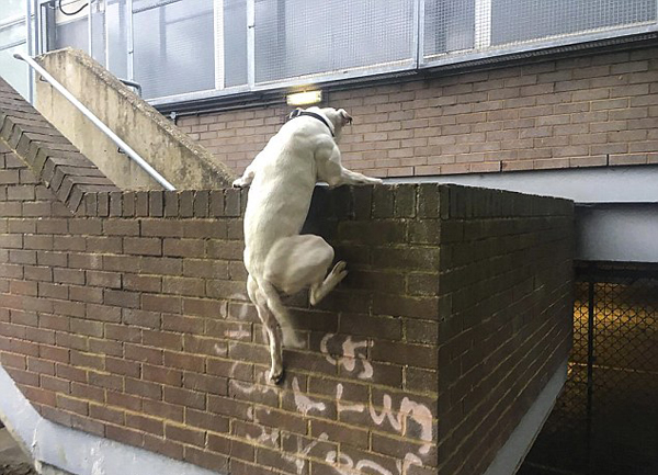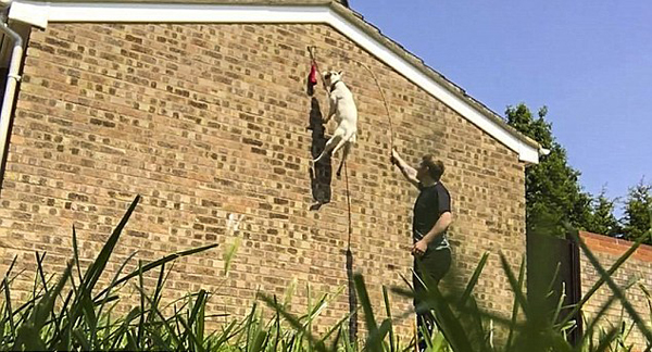 视频中这只白色的小狗名叫斯托姆,是一只斯塔福德郡牛头梗,18个月大。它的主人曼宁夫妇在它7周大时把它领回家中。曼宁说,斯托姆在很小的时候就显示出超常的运动天赋,几个月大时就常常抱着他的大腿往上爬,而且还是一个爬树好手。