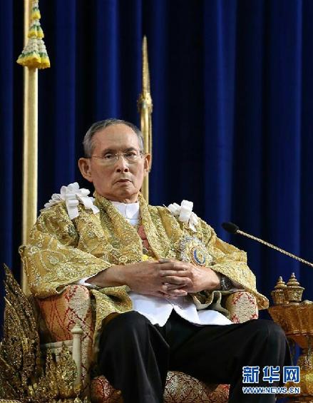 这是泰国国王普密蓬·阿杜德在华欣出席生日庆祝活动的资料照片(2013年12月5日摄)。泰国王宫宫务处发布公告,泰国国王普密蓬·阿杜德于2016年10月13日下午15时52分去世。 新华社发(泰国王宫宫务处供图)