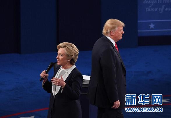 10月9日,在美国密苏里州圣路易斯的华盛顿大学,美国民主党总统候选人希拉里·克林顿(左)在辩论会现场发言。当日,美国共和党总统候选人唐纳德·特朗普和美国民主党总统候选人希拉里·克林顿在华盛顿大学参加2016年美国总统候选人第二场电视辩论。新华社记者殷博古摄