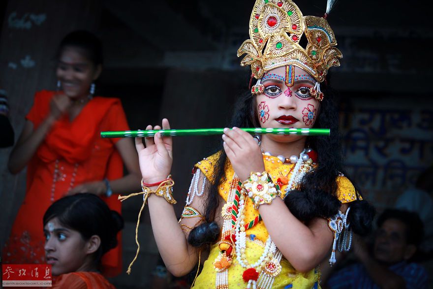 印度瓦拉纳西一个男孩穿着Krishna传统服装。