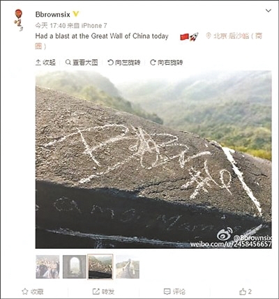 今年10月10日, NBA火箭队球员鲍比·布朗同队友一道游览慕田峪长城时,在长城砖石上刻写了自己的名字和球衣号码,并将之拍照留存,并上传至微博。布朗的这一举动,随即引发大规模网络质疑。尽管其随后删除了涉事微博,仍然未能避免被大量网友批评谴责。