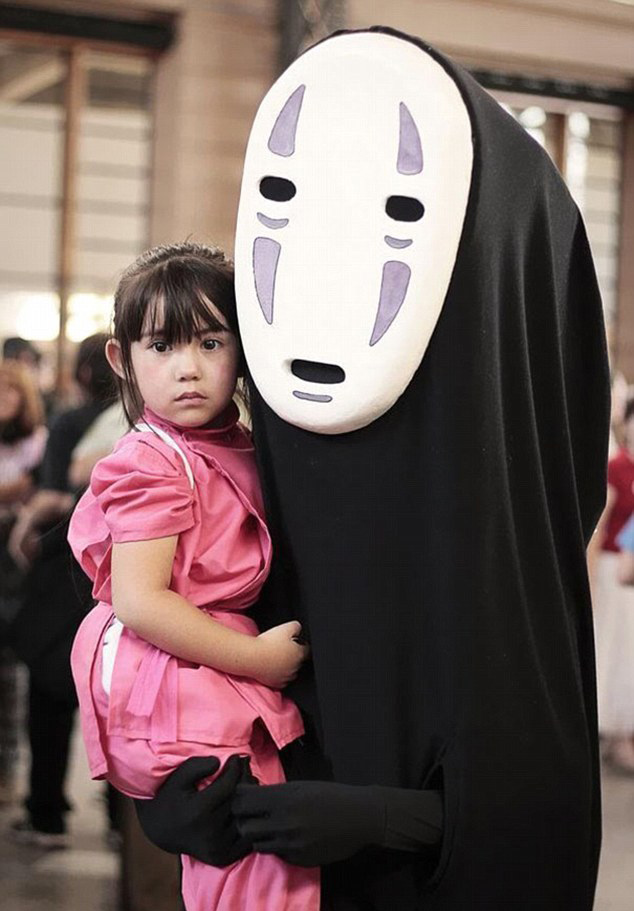 还有一对父女装扮成了日本动画《千与千寻》中的无脸男和千寻,网友调侃称无脸男想要吃掉小千寻的模样搞笑十足。