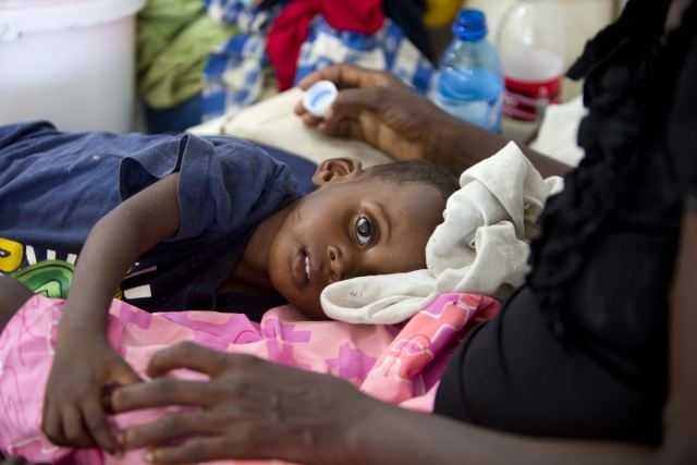 10月11日,在海地大湾省一个城镇,一名患霍乱的男孩接受治疗。