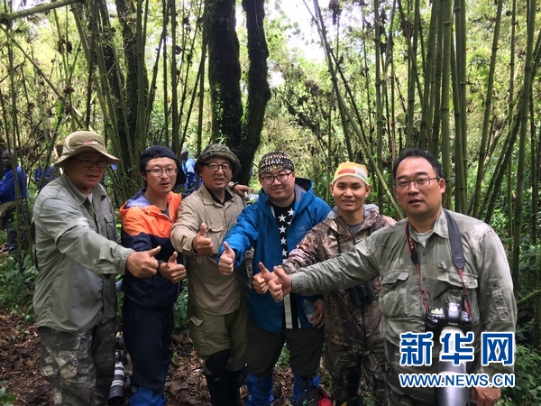 考察小组在卢旺达火山国家公园探访山地大猩猩途中,左一为中国国家动物博物馆副馆长孙忻,左二为中国国家地理杂志科考领队赵超。新华网记者杨孟曦摄