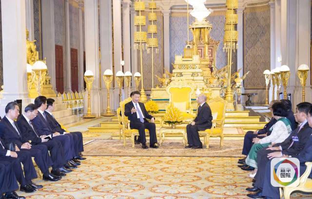 习近平在金边会见柬埔寨国王西哈莫尼。(新华社记者谢环驰摄)