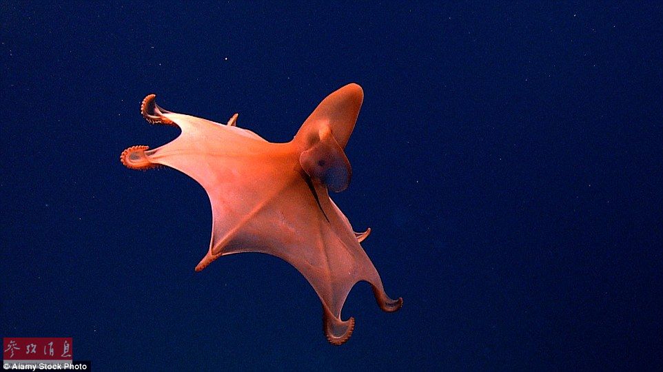 小飞象章鱼:它们的鳍长得很像大象的耳朵,所以就以迪士尼动物《小飞象》(Dumbo)命名。体长20厘米左右。深海小型种,体半凝胶质。体前后收缩。外套腔开口为一窄缝,漏斗短小。内壳U形。小飞象章鱼通常生活在海底,平均寿命为3至5年。以在水深400-4800米最多。它们寻找猎物时徘徊在海床之上很短的距离。