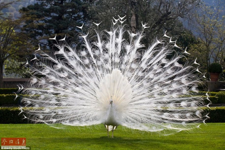 白孔雀全身洁白无瑕,羽毛无杂色,眼睛呈淡红色。白孔雀是人工繁育下蓝孔雀的变异品种,变异率约为1/1000,较为罕见。这主要是由于基因突变的低频性导致的。另外,在雌孔雀眼里,雄白孔雀的单调色彩不会有蓝孔雀和绿孔雀的斑斓更具有吸引力。但经过人工驯养,白孔雀已经达到了种群自我维持的状态。