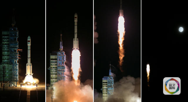 图为2016年9月15日,中国在酒泉卫星发射中心用长征二号F T2火箭将天宫二号空间实验室发射升空(拼版照片)。(新华社记者琚振华摄)