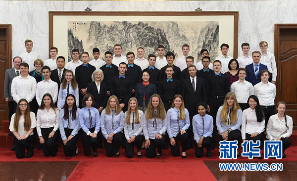 10月19日,中国国家主席习近平夫人彭丽媛在北京钓鱼台国宾馆会见德国伯乐高级文理中学师生。 新华社记者 谢环驰 摄