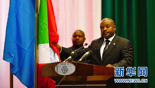 2010年8月26日,在布隆迪首都布琼布拉,布隆迪总统皮埃尔·恩库伦齐扎右手执国旗一角进行就职宣誓。(资料图片)