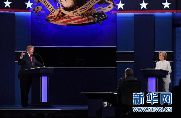 10月19日,在美国拉斯维加斯的内华达大学拉斯维加斯分校,美国共和党总统候选人唐纳德·特朗普(左)和美国民主党总统候选人希拉里·克林顿参加2016年美国总统候选人第三场也是最后一场电视辩论。新华社记者殷博古摄