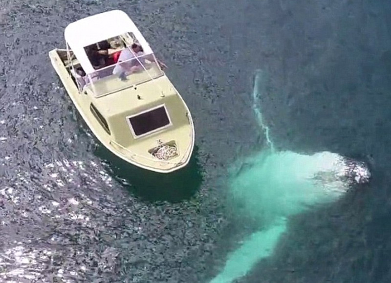 去年,一只好奇的座头鲸靠近澳大利亚黄金海岸的一艘渔船。