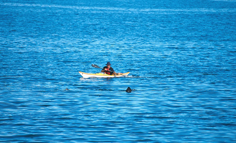 当鲨鱼穿过水域,到达皮划艇周围时,寻求刺激的船长张嘴而笑,图片摄于苏格兰。