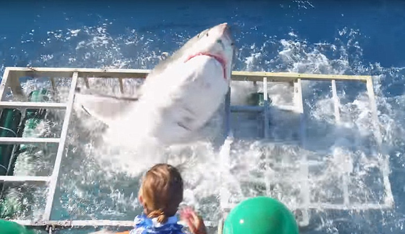 最近,在墨西哥沿岸瓜达卢佩岛,一只大白鲨被迫进入位于一位潜水者的水笼,但它最终设法游走了,而潜水员幸运逃脱,并未受伤。