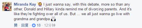 “在这场辩论中,特朗普和希拉里就好像一对要离婚的夫妇,为争取我们而战。但是,我们只想跟祖父母生活。”