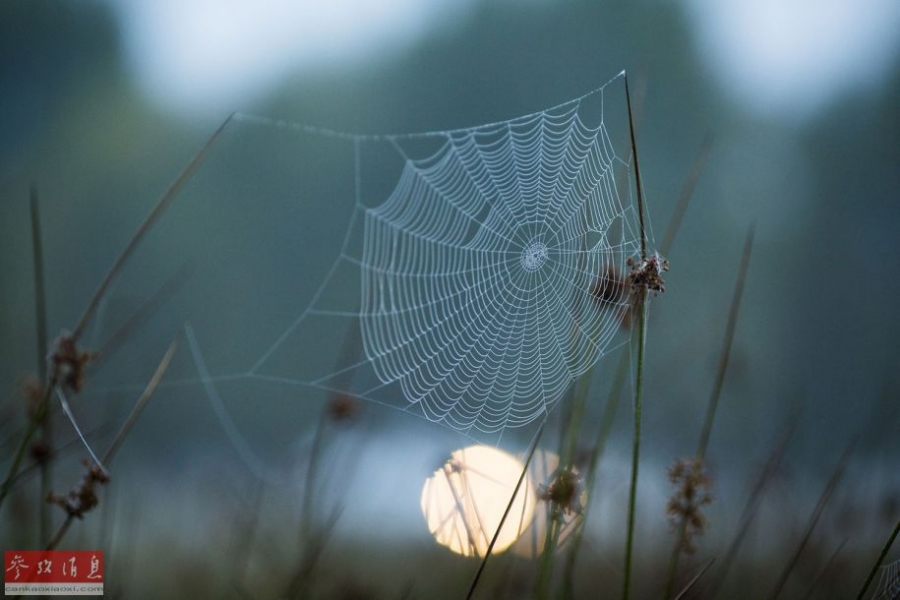 英国伦敦,清晨时分一只蜘蛛编织的网格外显眼。