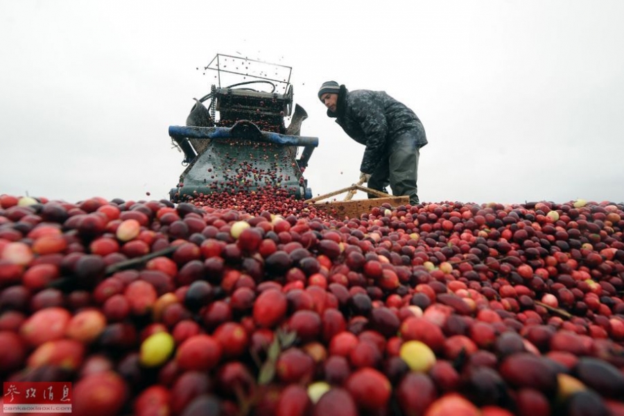 白俄罗斯明斯克,人们收获小红莓。