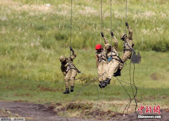资料图:当地时间8月25日,日本御殿场市东富士演习场,日本陆上自卫队举行年度富士综合火力演习。图为日本自卫队队员进行机降演示。