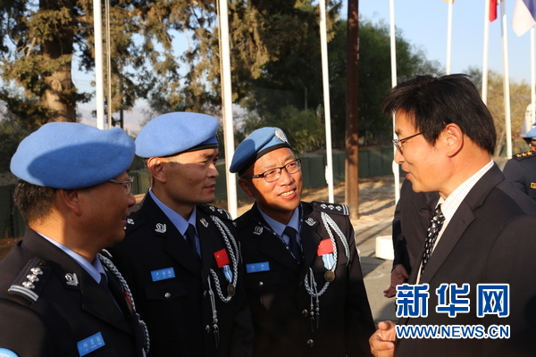 中国驻塞浦路斯大使黄星原询问中国维和警察工作情况。新华网发