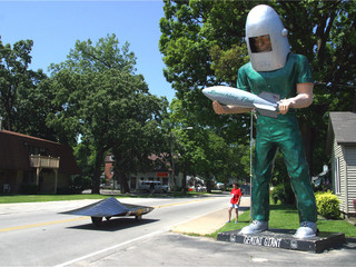 这是个身高7米的巨人像,头有衣柜那么大,躯干能轻松装进一张双人床。45年来,它矗立在密苏里州欧扎克湖市巴格内尔大坝地带,肩负着吸引路人驶离干道、下车一游的使命。这个地区当年曾是旅游景点,如今早已荒废。