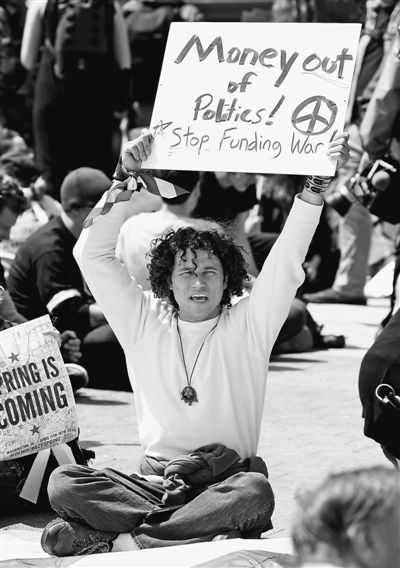 今年以来,美国民众多次因不满金钱政治进行游行示威。图为美国民众在国会大厦前静坐,抗议金钱政治现象,要求让金钱远离政治。 人民视觉
