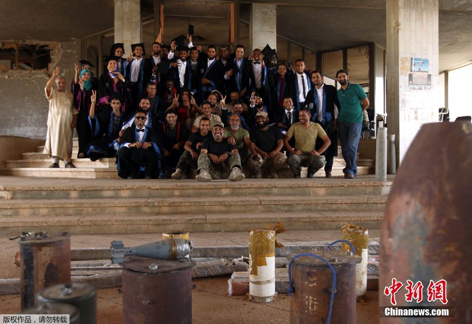 利比亚大学遭战火摧毁 学生在炮弹废墟前拍毕业照(高清组图)