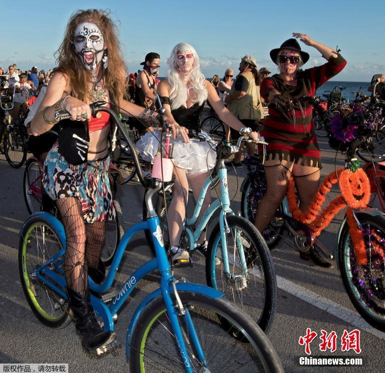 当地时间2016年10月23日,美国佛罗里达州基韦斯特,民众装扮成僵尸参加骑行,约有8000人参加此次活动。