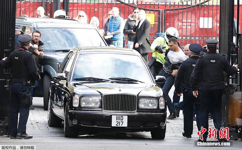 当地时间2016年10月26日,英国伦敦,一名男子试图袭击巴林国王车辆被警察阻止。当日,巴林国王哈马德访问英国,抵达唐宁街会面英国首相特雷莎。
