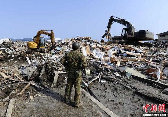 资料图:此前,一名日本自卫队队员在宫城县石卷市查看灾后重建工作情况。(记者侯宇 摄)
