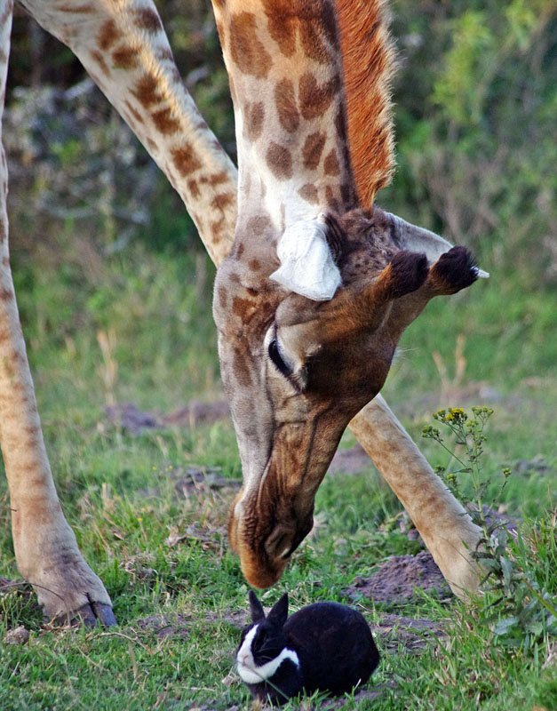 据坎托介绍,当时她和女儿正在南非Kragga Kamma 野生动物保护区附近驾车游玩,坎托被晚霞照耀下的长劲鹿群所吸引,于是下车拍起了照片。拍摄的过程中,她惊讶地发现有一只长颈鹿的底下竟然藏着一只兔子,而它们看上去互为同伴,相处得十分融洽。