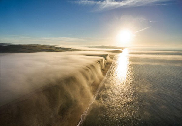 据英国《每日邮报》10月27日报道,英国摄影师詹姆斯·洛夫里奇位在多塞特郡的西湾悬崖处,使用无人机拍摄下了清晨8点由于“逆温现象”形成的壮丽景象——笼罩在悬崖周围的雾气,如瀑布般奔腾而下,美得令人窒息。