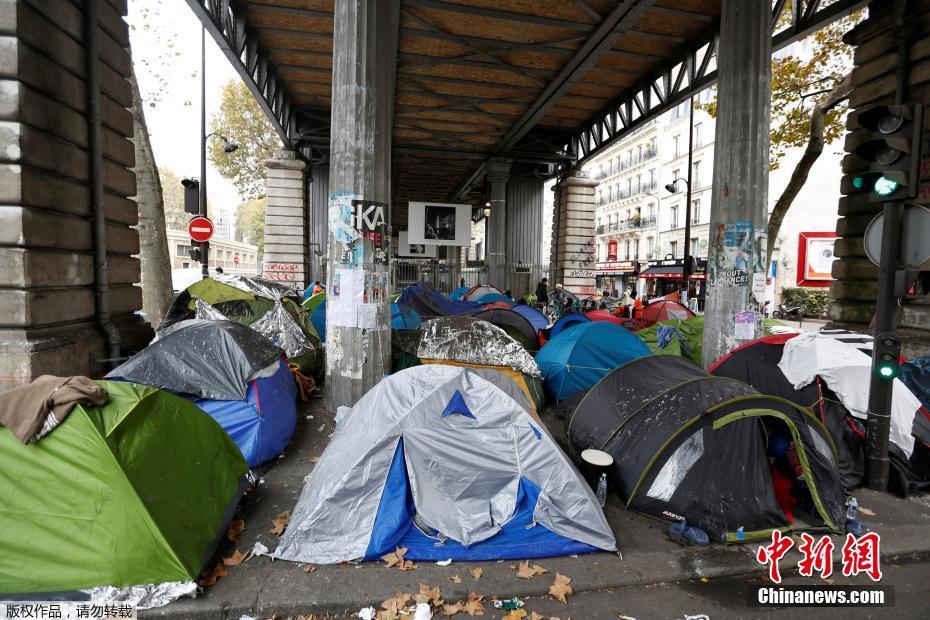 当地时间2016年10月28日,法国巴黎饶勒斯地铁站附近,移民搭建帐篷暂居。法国政府彻底清除加莱“丛林”营地的行动仍在进行,大批不愿接受安置的难民和移民涌入巴黎。巴黎市政府官员27日晚证实,回到巴黎街头“安营扎寨”的移民数量大约在1500至2000人之间。