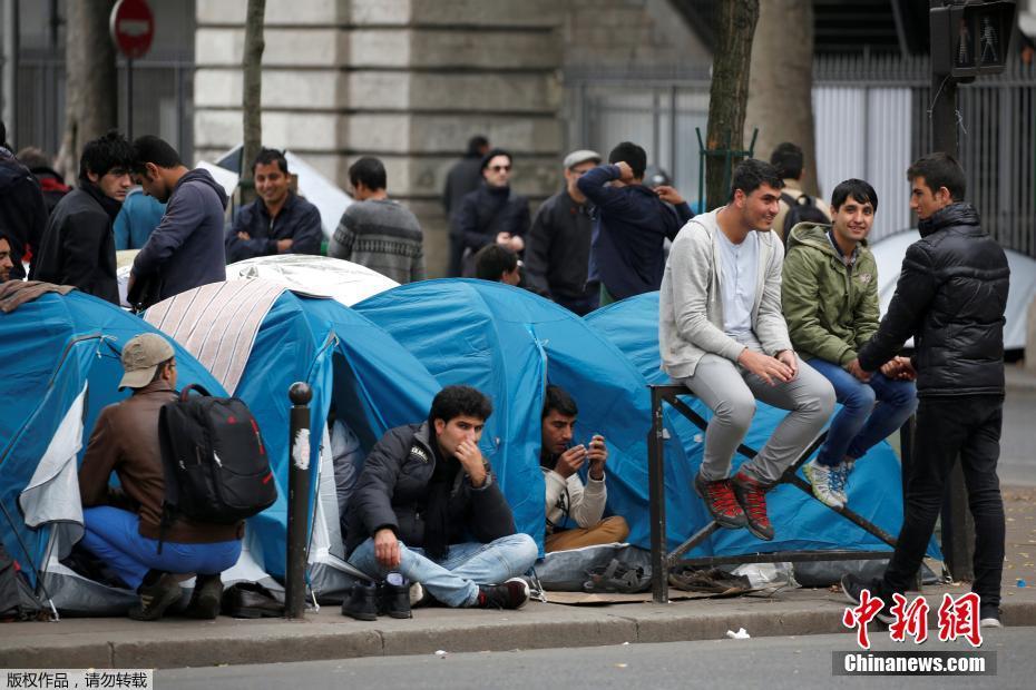 当地时间2016年10月28日,法国巴黎Jaures地铁站附近,移民搭建帐篷暂居。法国政府彻底清除加莱“丛林”营地的行动仍在进行,大批不愿接受安置的难民和移民涌入巴黎。巴黎市政府官员27日晚证实,回到巴黎街头“安营扎寨”的移民数量大约在1500至2000人之间。