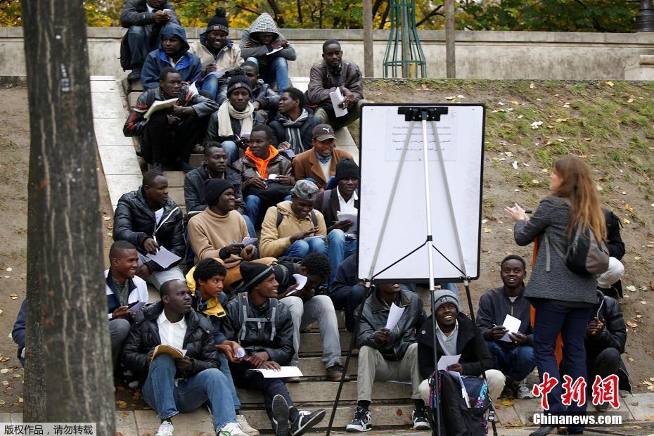 一些移民在巴黎街头学习法语课程。