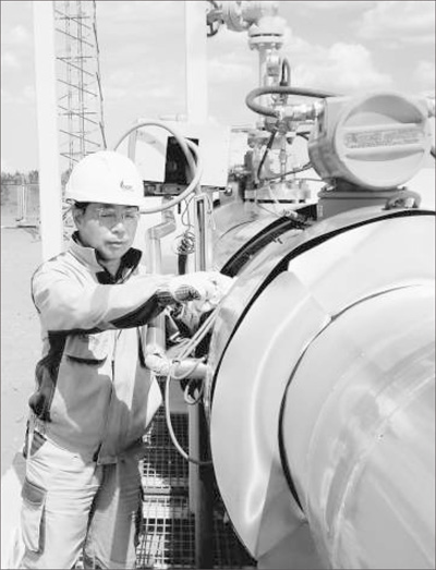 图一为褚军在乌哈边境计量站现场对超声波流量计设备进行维护。中石油中亚管道有限公司供图