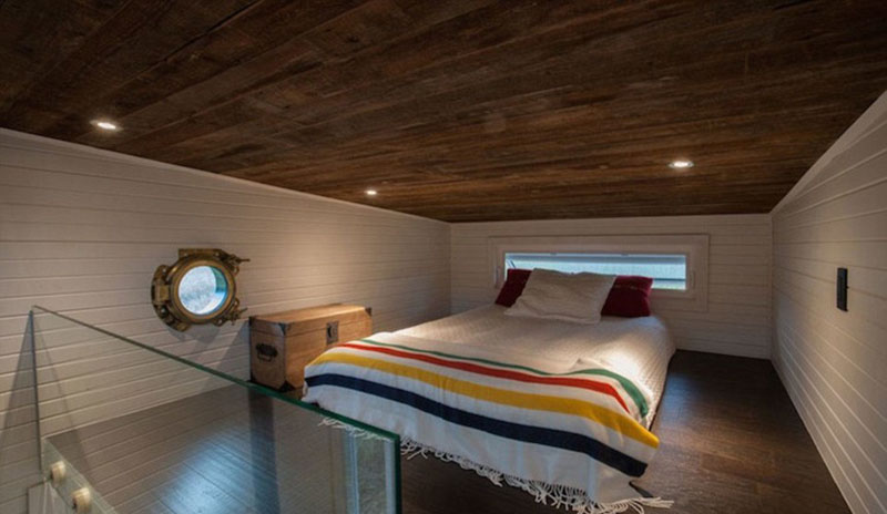 二层是一个夹层空间,可放下一张双人床,夹层天花板有一道透明窗户,可为该区域提供光源。车上自带太阳能板,能确保在无电的环境下居住生活;还配有集雨桶、无水厕所和电动吊桥,吊桥打开后可拓展活动空间。