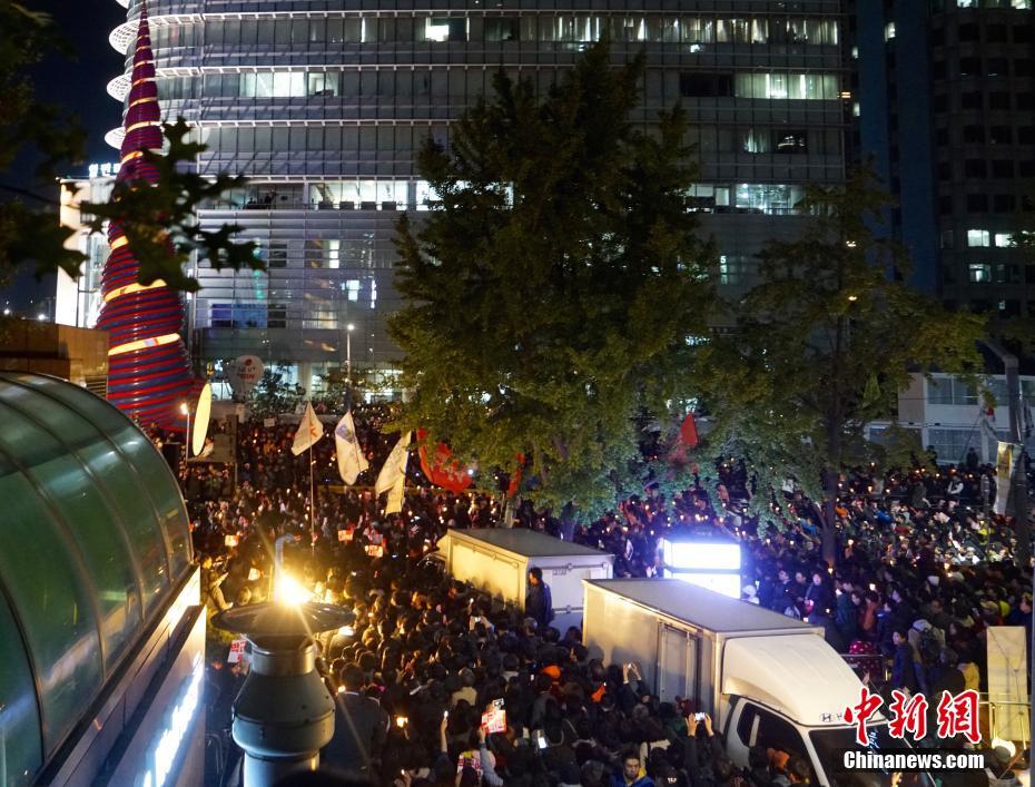 10月29日晚,近两万名韩国民众及民间团体人士在首尔市中心举行烛光集会,谴责“亲信干政事件”给韩国社会带来的不良影响,要求总统朴槿惠对此事负责。图为集会现场。中新社记者 吴旭 摄